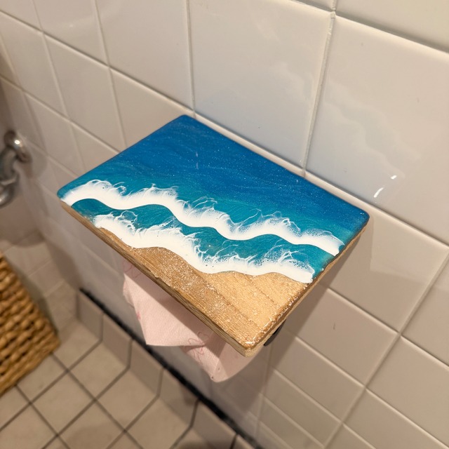トイレにも海の華やかさを与えてくれるトイレットペーパーホルダー♡ 殺風景になりがちなトイレにも海を取り入れることで、お部屋の素敵な空間の一つに。 トイレットペーパーを横からスライドさせるだけで良いので、お子様でも簡単にトイレットペーパーのつけ外しができる仕組みです。 【穴あけ不要】 粘着テープとネジの両方が付属されています。賃貸物件や穴が合わない場所でも、簡単に取り付け可能です。 ◼︎サイズ: 幅18cm×奥行13.2cm (ペーパー部分:高さ6.7cm×幅12.7cm) ◼︎カラー: ・Waimanalo Blue ・Kailua Blue ・Ishigaki Blue ・Kabira Blue ◼︎その他: ・粘着テープとネジの両方が付属になっているので、賃貸など穴を開けられないご自宅でも【穴あけ不要】で接着させることができます。 ・選択された海カラーに合わせた木の色を選択してお作りします。 色の出し方や波の作り方は、レジンアーティストMAYUならではの技法。 レジンアートは、色の出し方から波の作り方まで ひとつひとつ全て異なり、同じ作品はひとつとしてありません。 世界に一つしかないあなただけの海をお楽しみください♡ ◆注意事項◆ <発送について> 商品は殆ど全てが受注制作となります。そのため、発送まで約3週間〜8週間ほどお時間をいただきます。納品時期は、オーダー数や時期により変動致しますので、具体的な納品時期を知りたい場合はメッセージにてご連絡ください。完成品のみのご購入の場合、配送のご依頼を受けてから5営業日以内に発送いたします。完成品とオーダー品を同時にご購入いただいた場合、オーダー品完成後に同時発送となりますので予めご了承ください。 <作品について> ひとつひとつ手作業で制作しているため、写真と同様の波の形や柄はお選びいただけません。また、丁寧に作業をしておりますが、エポキシレジンの特性上ヘコミ等がある場合や、細かな傷や稀に小さな埃等が混入する場合がございます。 作品制作時、アートを施す場所以外はマスキングを行なっておりますが、微量のレジン液が残る場合がございます。そちらもハンドメイド作品の一部としてお楽しみください。 <レジンの特性> ・できる限り、直射日光を避けた場所での保管をお願い致します。(高温になると変形する可能性がございます) ・衝撃を与えますと、ヒビや傷の原因となりますのでご注意ください。 ・レジンは傷つきやすい性質のため、強く擦らず柔らかい布で優しく拭いてお手入れをお願い致します。 ・ご覧頂く光の加減によって、色味が写真と多少違って見える場合もございます。