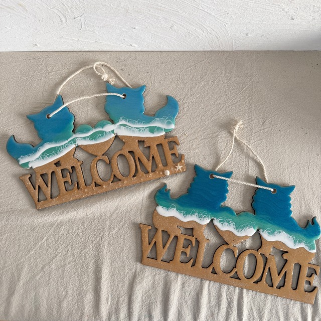 オーシャンウェルカムボード♡ お店や自宅、結婚式の飾りなどにも使える沖縄らしいシーサータイプのウェルカムボードです。 お友達や家族が訪れた際には、温かいおもてなしの雰囲気を演出してくれます♡ シーサーは2種類(TypeA/TypeB)から、波の数は1つ/2つから選んでいただくことができます。 ◼︎サイズ: 縦18cm×横30cm ◼︎カラー: ・Waimanalo Blue ・Kailua Blue ・Ishigaki Blue(写真TypeB) ・Kabira Blue(写真TypeA) ◼︎その他: ・備考欄に必ず以下3点をご記入ください。 ①TypeA or TypeB ②貝殻あり or 貝殻なし ③波1本 or 波2本 ・紐の長さは長めにカットしているため、お好みの長さに調整可能です。 色の出し方や波の作り方は、レジンアーティストMAYUならではの技法。 レジンアートは、色の出し方から波の作り方まで ひとつひとつ全て異なり、同じ作品はひとつとしてありません。 世界に一つしかないあなただけの海をお楽しみください♡ ◆注意事項◆ <発送について> 商品は殆ど全てが受注制作となります。そのため、発送まで約3週間〜8週間ほどお時間をいただきます。納品時期は、オーダー数や時期により変動致しますので、具体的な納品時期を知りたい場合はメッセージにてご連絡ください。完成品のみのご購入の場合、配送のご依頼を受けてから5営業日以内に発送いたします。完成品とオーダー品を同時にご購入いただいた場合、オーダー品完成後に同時発送となりますので予めご了承ください。 <作品について> ひとつひとつ手作業で制作しているため、写真と同様の波の形や柄はお選びいただけません。また、丁寧に作業をしておりますが、エポキシレジンの特性上ヘコミ等がある場合や、細かな傷や稀に小さな埃等が混入する場合がございます。 作品制作時、アートを施す場所以外はマスキングを行なっておりますが、微量のレジン液が残る場合がございます。そちらもハンドメイド作品の一部としてお楽しみください。 <レジンの特性> ・できる限り、直射日光を避けた場所での保管をお願い致します。(高温になると変形する可能性がございます) ・衝撃を与えますと、ヒビや傷の原因となりますのでご注意ください。 ・レジンは傷つきやすい性質のため、強く擦らず柔らかい布で優しく拭いてお手入れをお願い致します。 ・ご覧頂く光の加減によって、色味が写真と多少違って見える場合もございます。