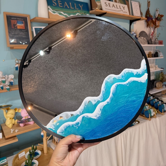 オーシャン壁掛けミラー♡ ご自宅のお部屋や寝室、バスルームなどにメイクアップミラーとして、インテリアとして飾ることのできる壁掛けミラーです。 美容院やアイサロンなどでお客様の仕上がり確認用ミラーなどにしても、おしゃれ度UPでオススメ♡ ミラーの縁をブラック/ゴールドからお選びください。 ◼︎サイズ: 直径40cm (壁掛けクギつき) ◼︎カラー: ・Waimanalo Blue ・Ishigaki Blue 色の出し方や波の作り方は、レジンアーティストMAYUならではの技法。 レジンアートは、色の出し方から波の作り方まで ひとつひとつ全て異なり、同じ作品はひとつとしてありません。 世界に一つしかないあなただけの海をお楽しみください♡ ◆注意事項◆ <発送について> 商品は殆ど全てが受注制作となります。そのため、発送まで約3週間〜8週間ほどお時間をいただきます。納品時期は、オーダー数や時期により変動致しますので、具体的な納品時期を知りたい場合はメッセージにてご連絡ください。完成品のみのご購入の場合、配送のご依頼を受けてから5営業日以内に発送いたします。完成品とオーダー品を同時にご購入いただいた場合、オーダー品完成後に同時発送となりますので予めご了承ください。 <作品について> ひとつひとつ手作業で制作しているため、写真と同様の波の形や柄はお選びいただけません。また、丁寧に作業をしておりますが、エポキシレジンの特性上ヘコミ等がある場合や、細かな傷や稀に小さな埃等が混入する場合がございます。 作品制作時、アートを施す場所以外はマスキングを行なっておりますが、微量のレジン液が残る場合がございます。そちらもハンドメイド作品の一部としてお楽しみください。 <レジンの特性> ・できる限り、直射日光を避けた場所での保管をお願い致します。(高温になると変形する可能性がございます) ・衝撃を与えますと、ヒビや傷の原因となりますのでご注意ください。 ・レジンは傷つきやすい性質のため、強く擦らず柔らかい布で優しく拭いてお手入れをお願い致します。 ・ご覧頂く光の加減によって、色味が写真と多少違って見える場合もございます。