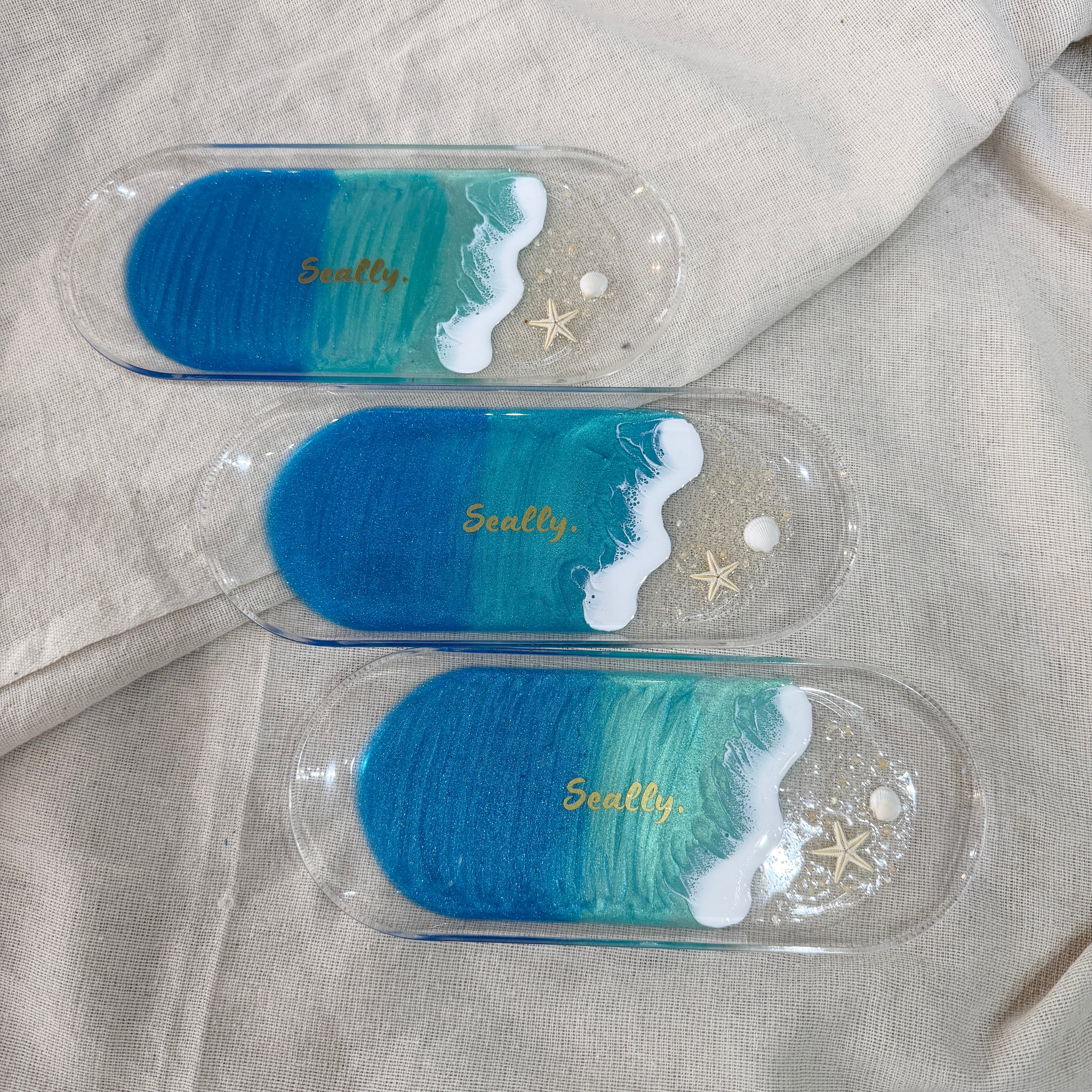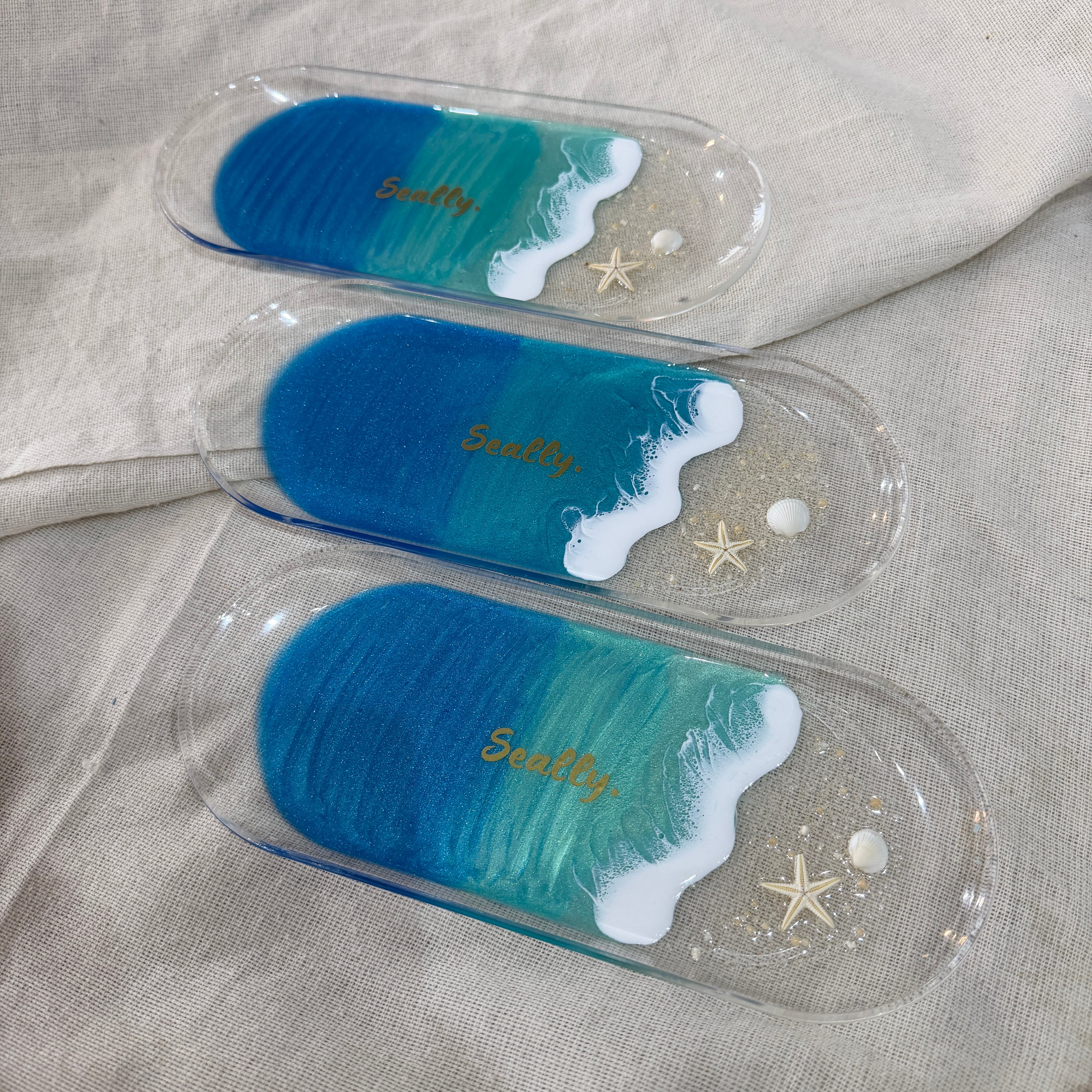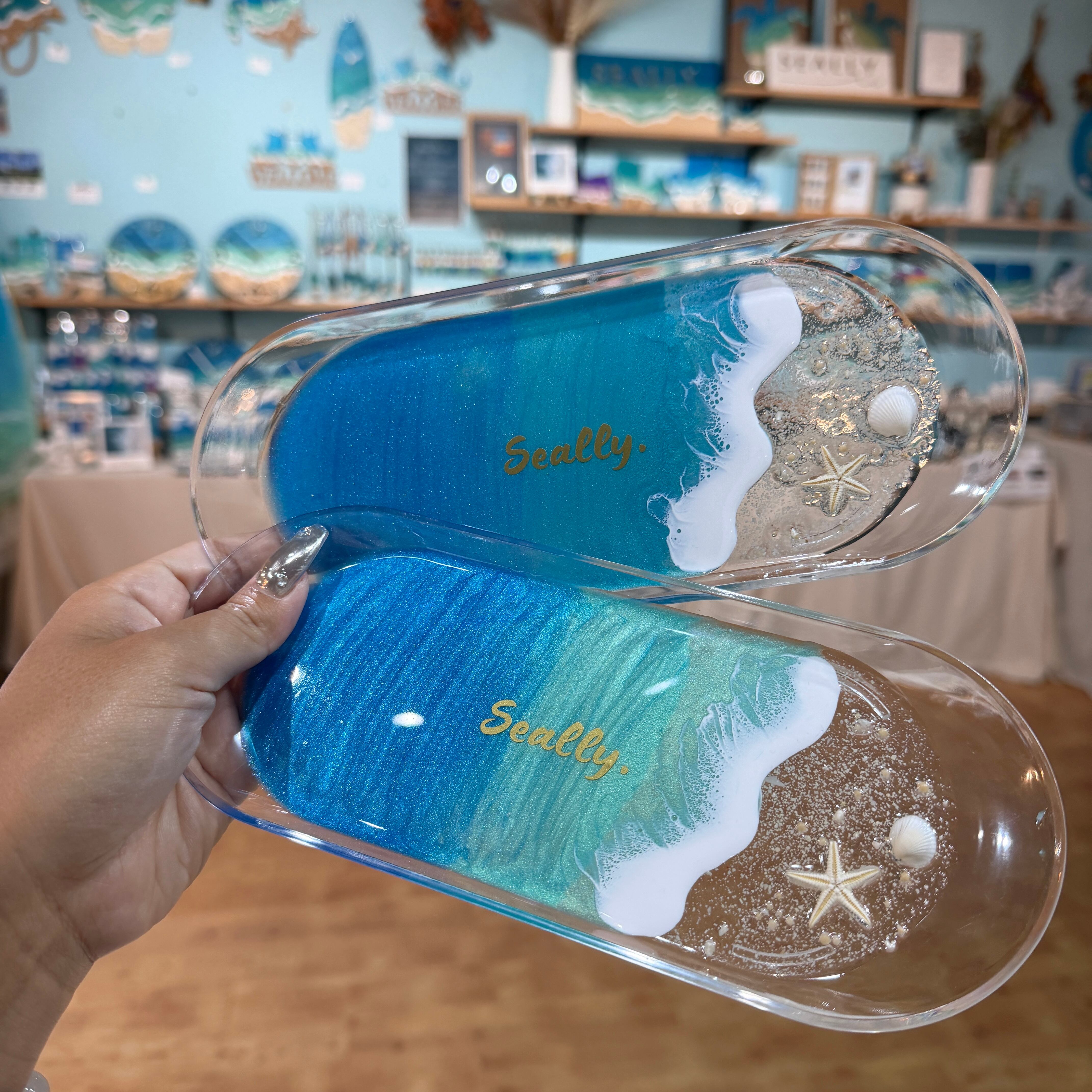 ひとつひとつ手作業で制作しているため、写真と同様の波の形や柄はお選びいただけません。また、丁寧に作業をしておりますが、エポキシレジンの特性上ヘコミ等がある場合や、細かな傷や稀に小さな埃等が混入する場合がございます。
