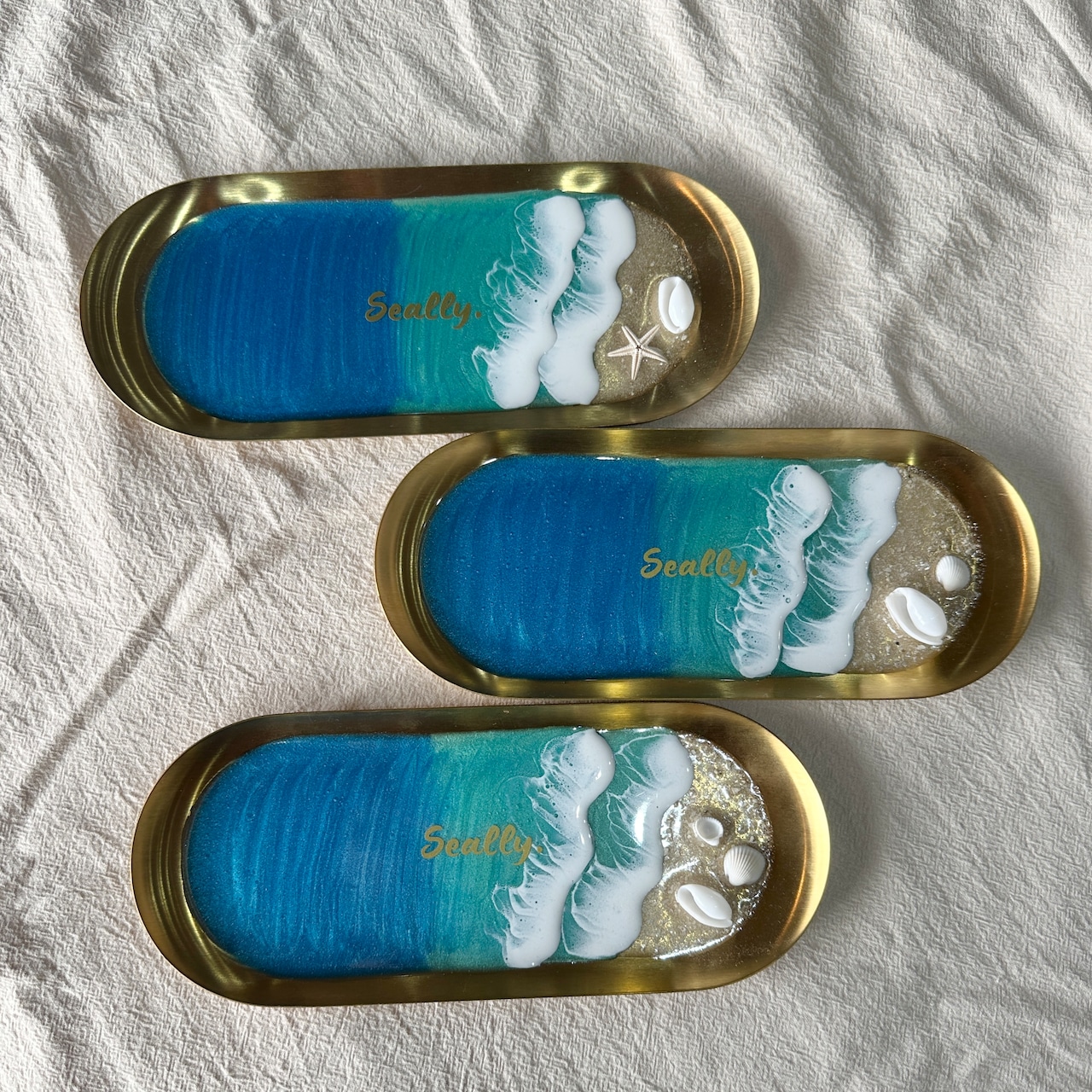 キラキラと輝く海に沖縄の砂と貝殻を装飾。使い勝手抜群のトレーです♡